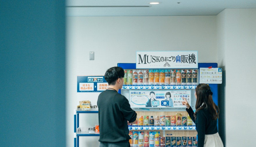 二人で一緒に社員証をかざすと、1日1回無料で飲み物やお菓子、アイスがもらえる特別な自販機です。「自販機に行かない?」など、新しい交流が生まれています。